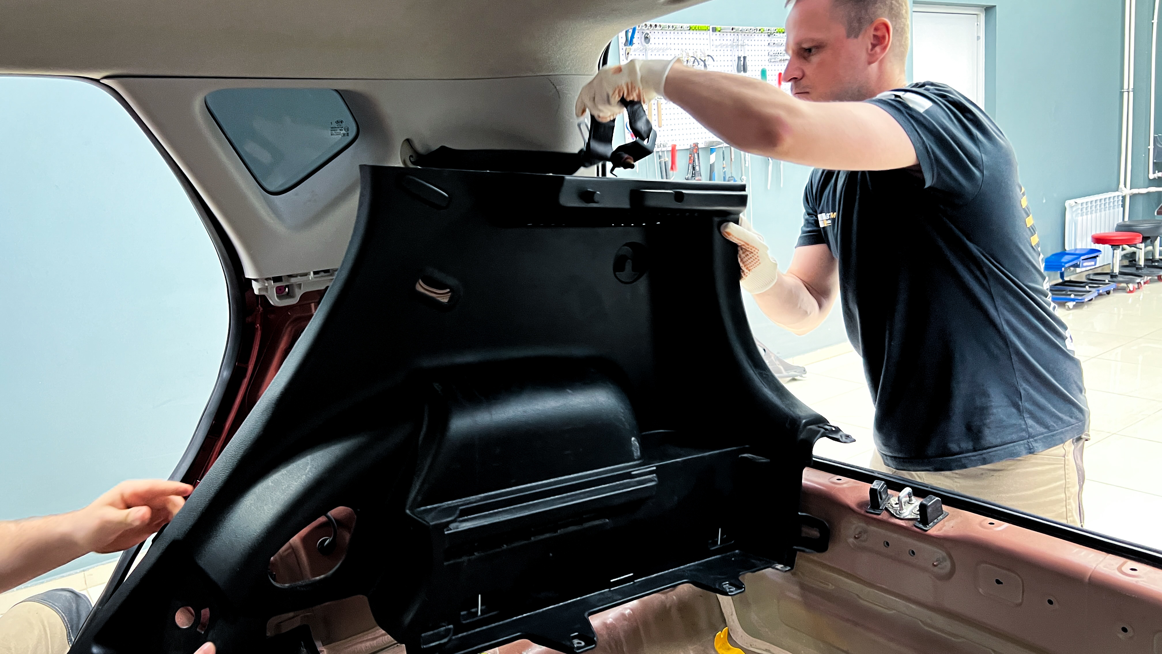Для виброизоляции крыши багажника используем материал Шумофф L2, чтобы свести увеличение веса к минимуму. После чего переходим к обшивке.