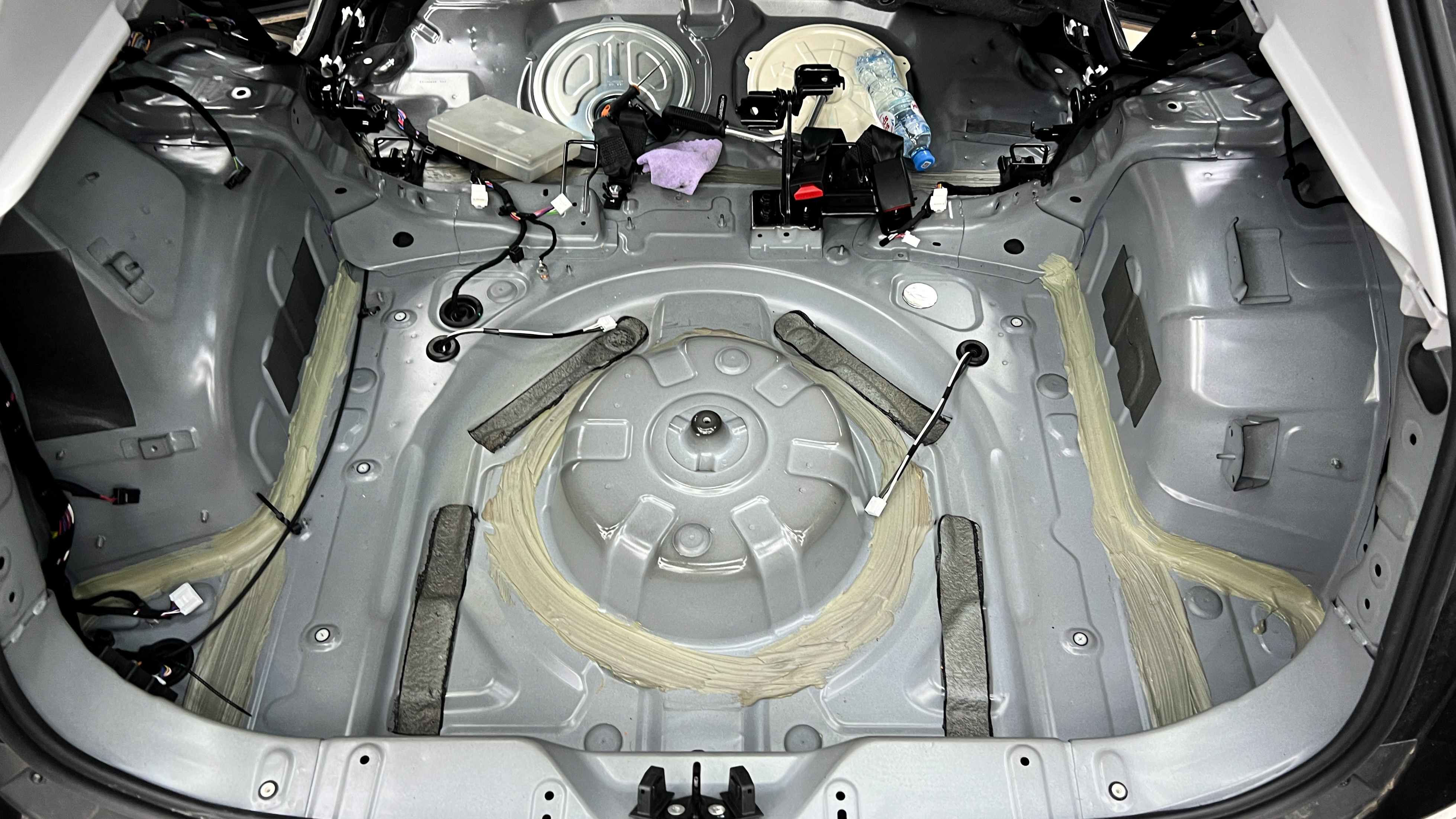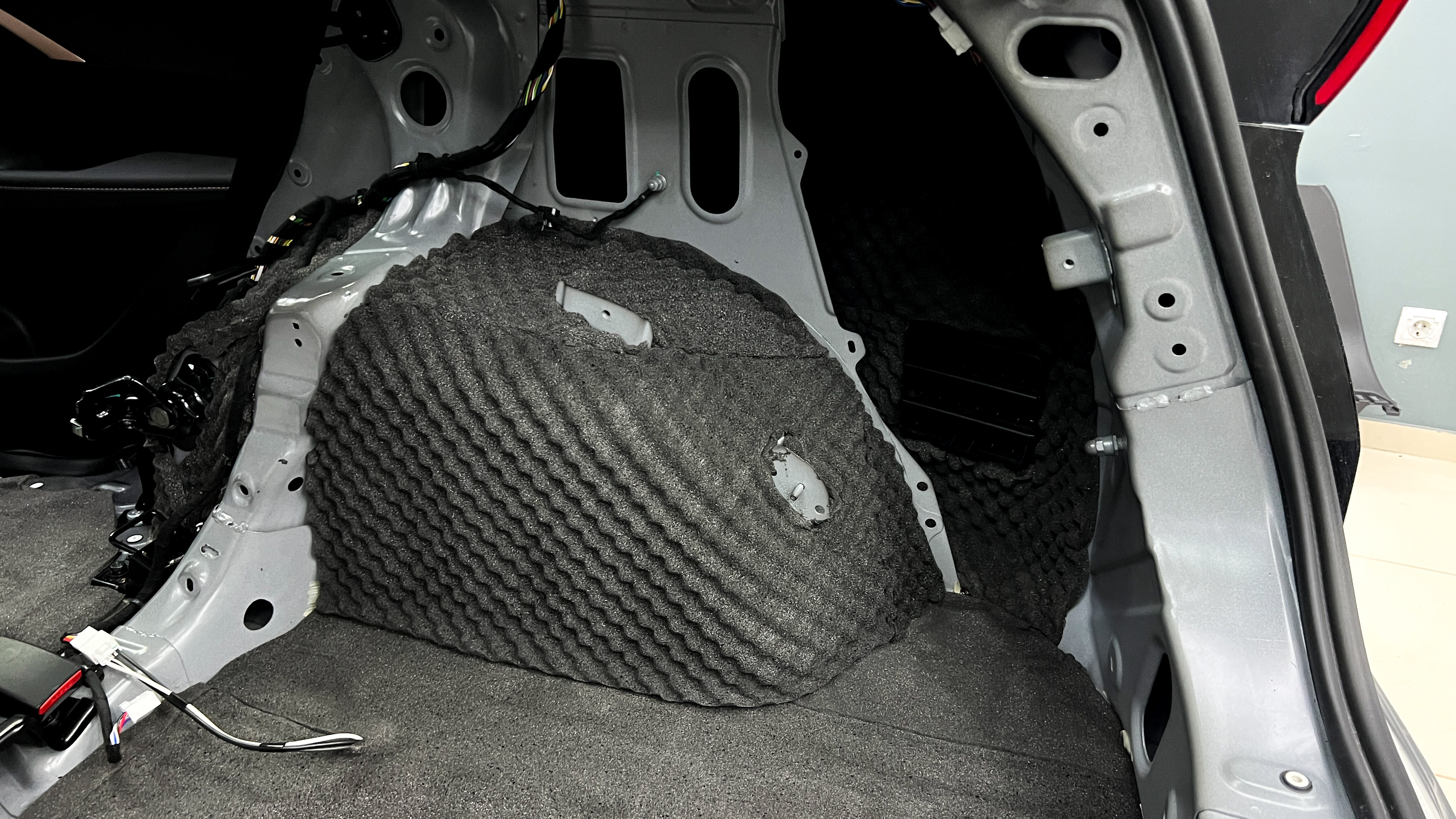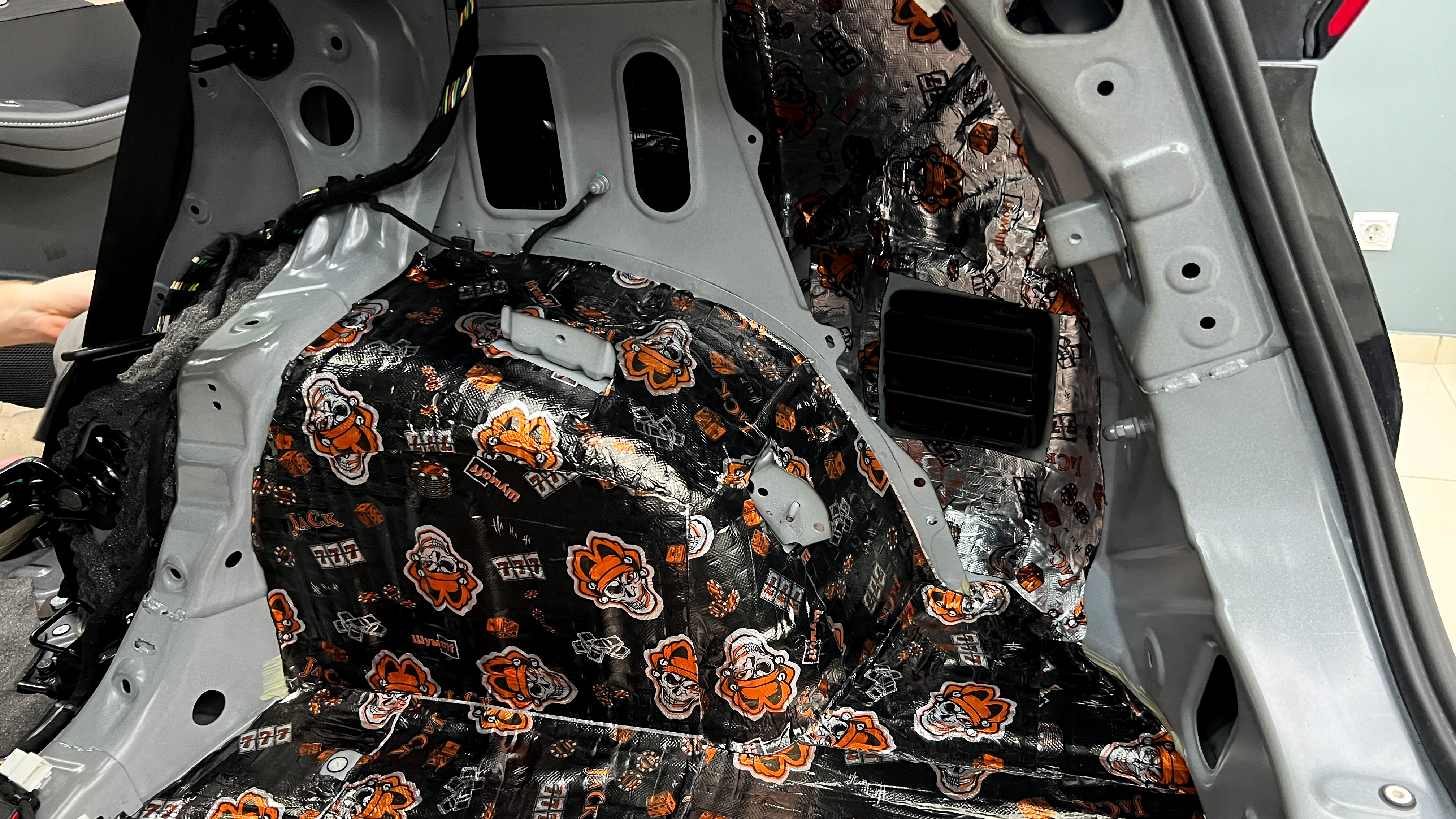 Дно багажника и крылья оклеиваются шумо и теплоизолятором Шумофф П4 4. Арки оклеиваются шумопоглотителем Flex A15.