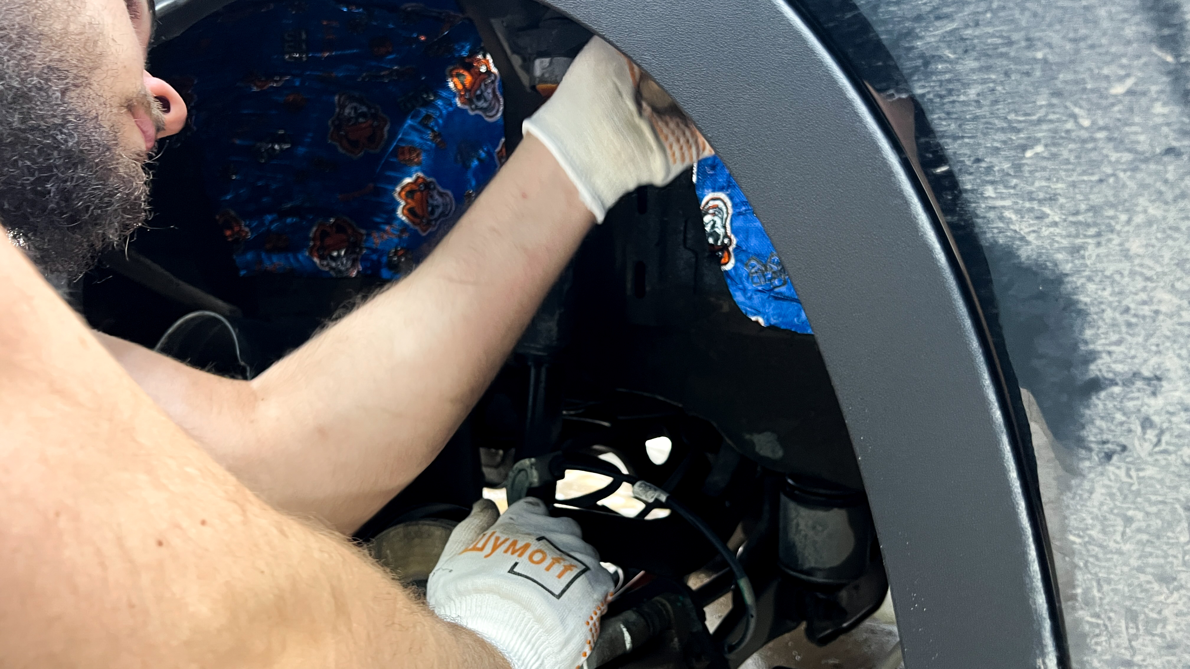 На крылья клеим также Шумофф Base 4 А для участка такого как арки используем шумопоглотитель Шумофф Flex A15. Что также позволит значительно уменьшить исходящий от них шум.
