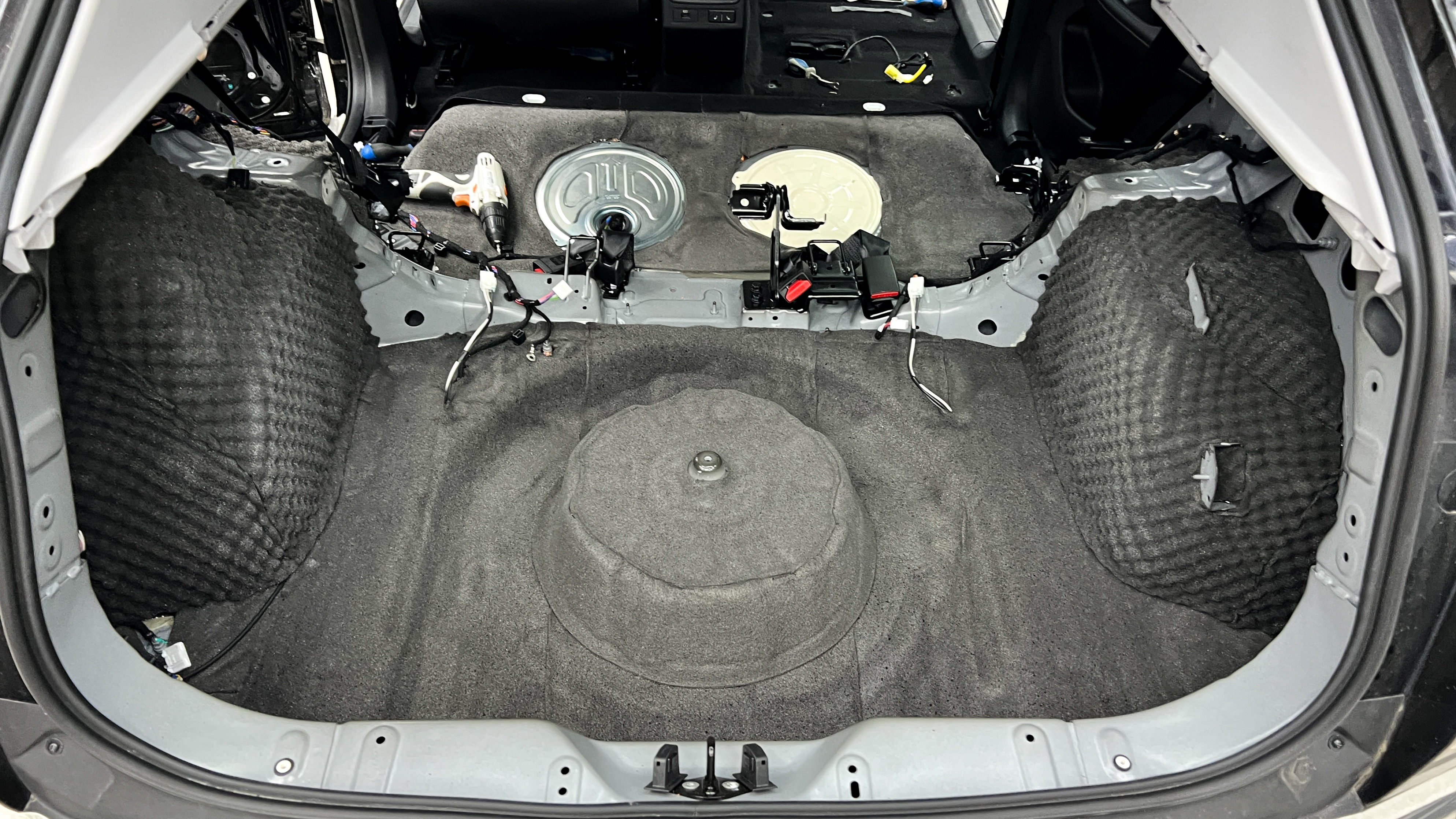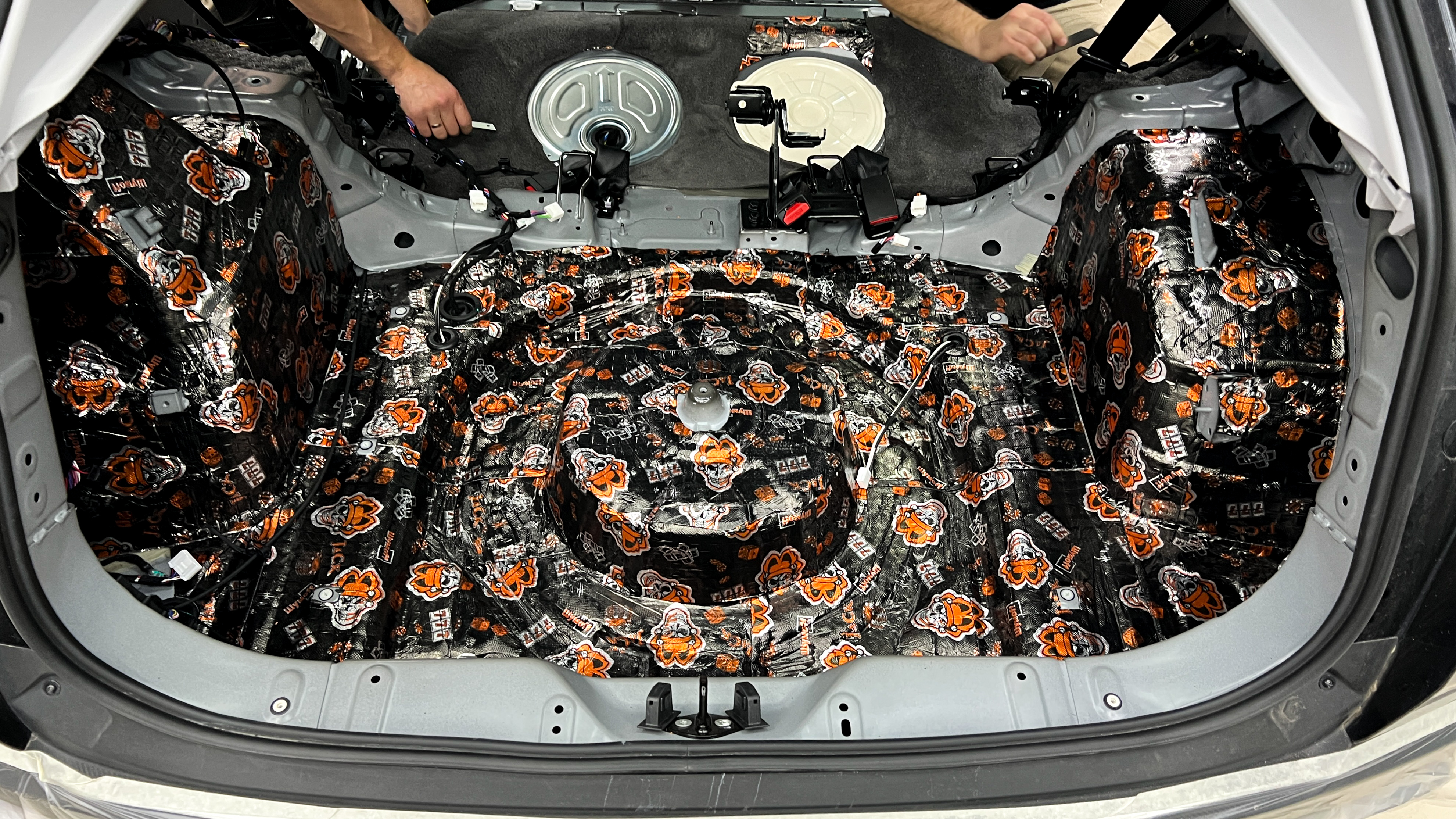 Обезжириваем поверхность и приступаем к монтажу второго слоя. Также для получения более эффективного результата используем компоновку из двух материалов На дно багажника клеим Шумофф Base 4. Этот слой позволит снизить нам шум от дороги.