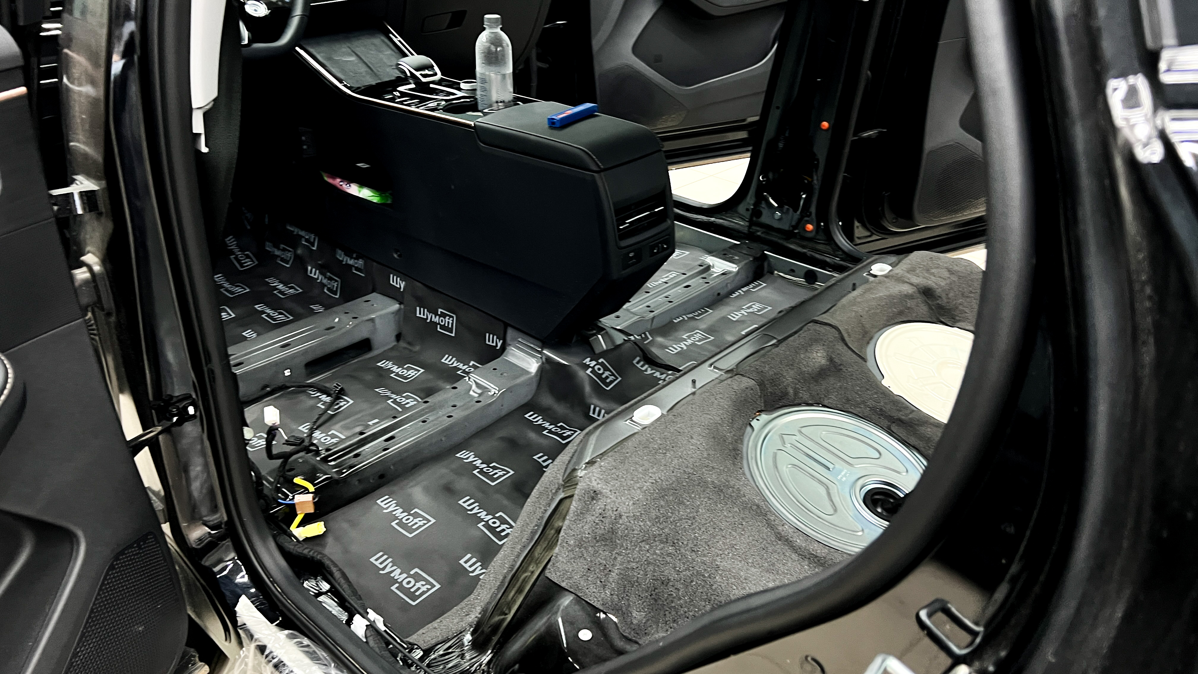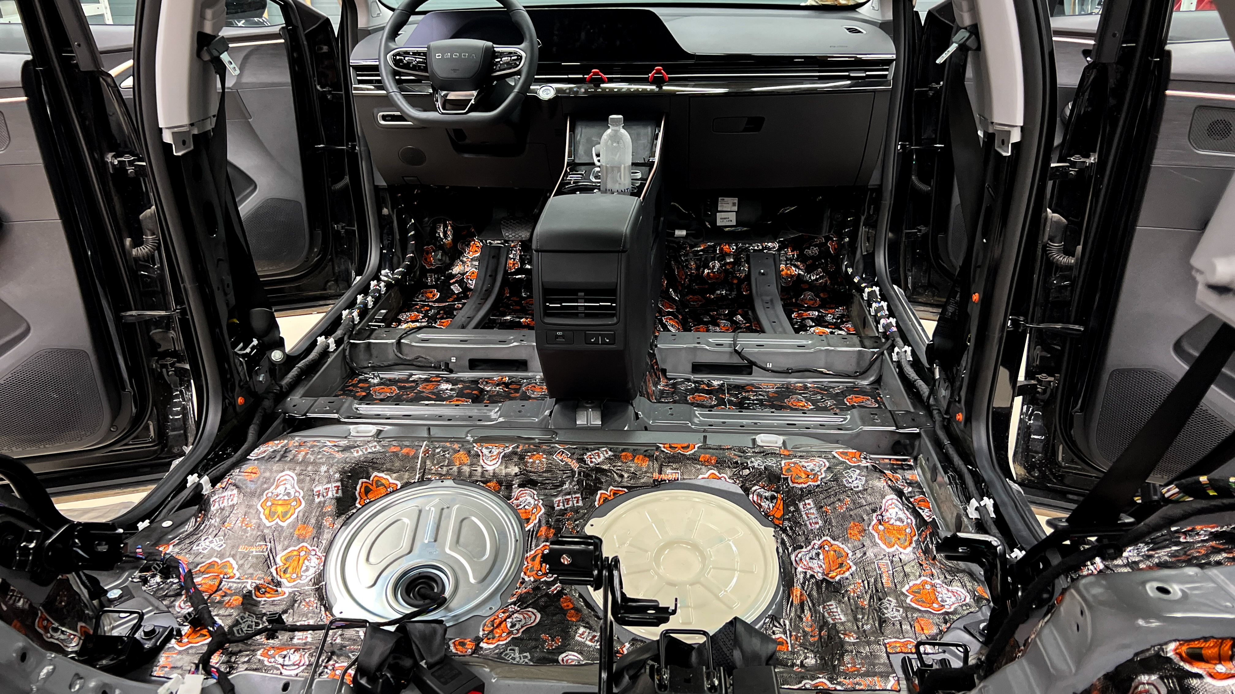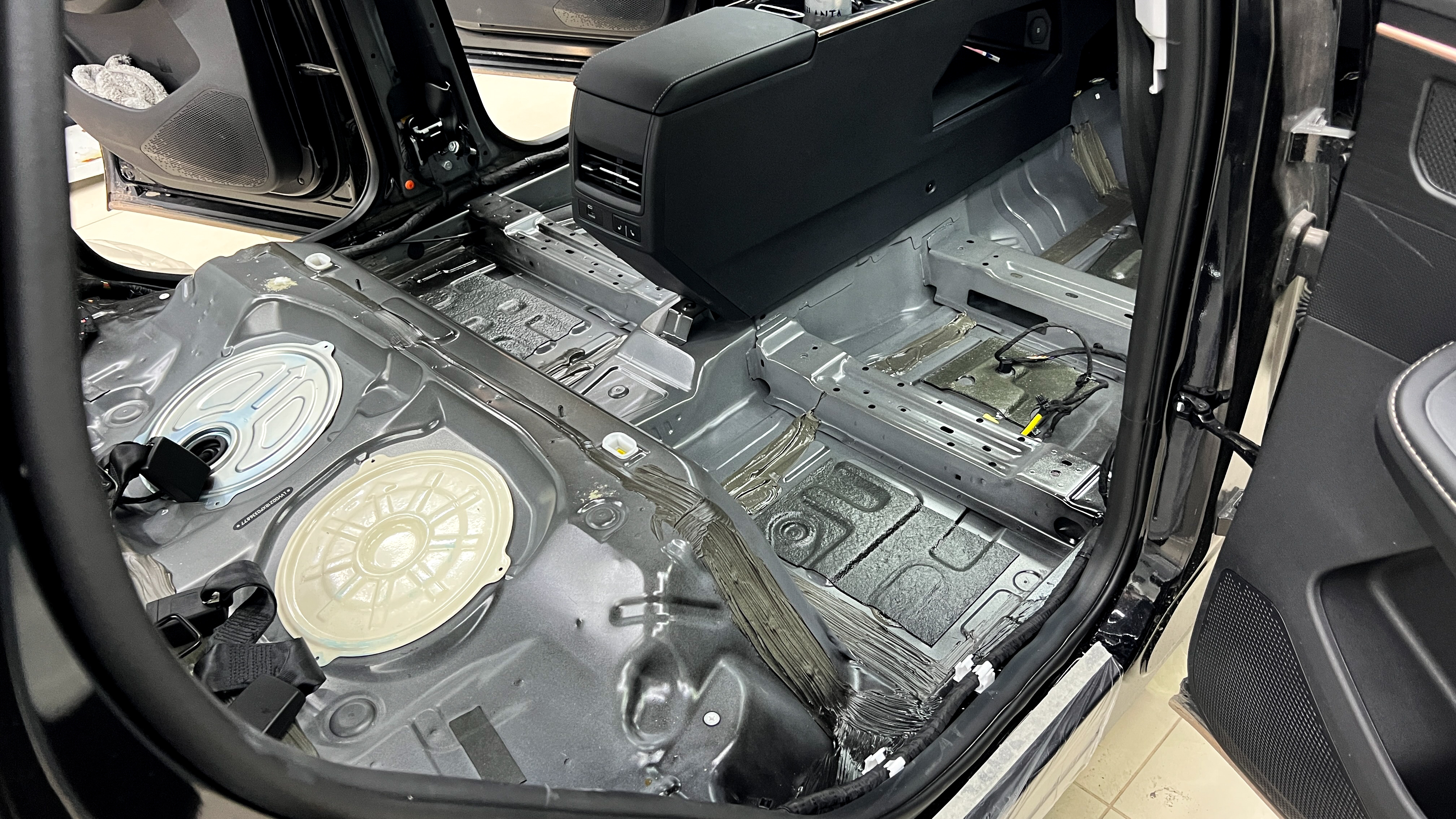От моторной перегородки и до заднего сиденья вмести с ним клеится мощный многослойный шумо и звукоизолятор Шумофф Prizma 6.