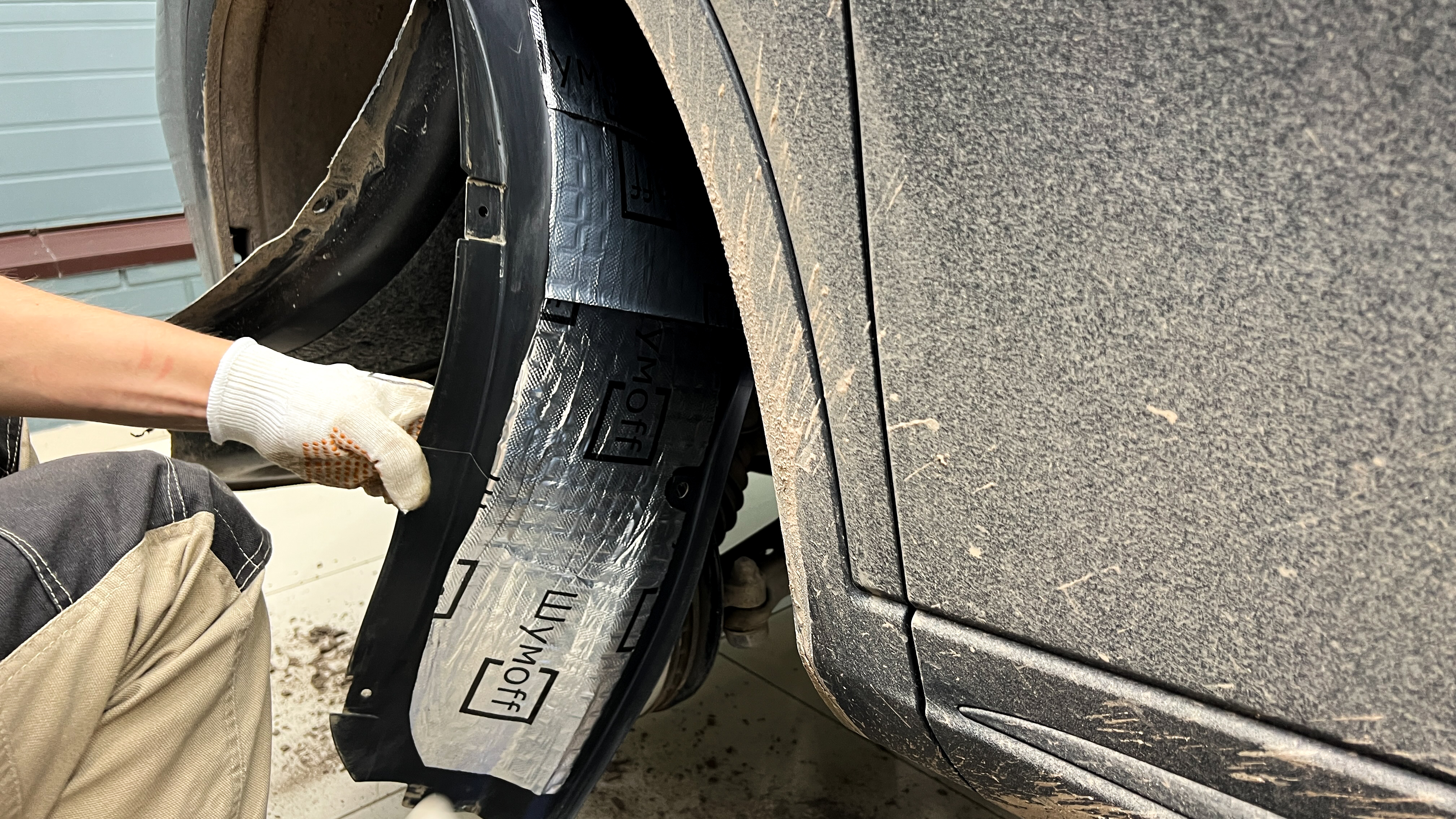 Третьим слоем на подкрылки монтируем виброизоляцию Шумофф М2
