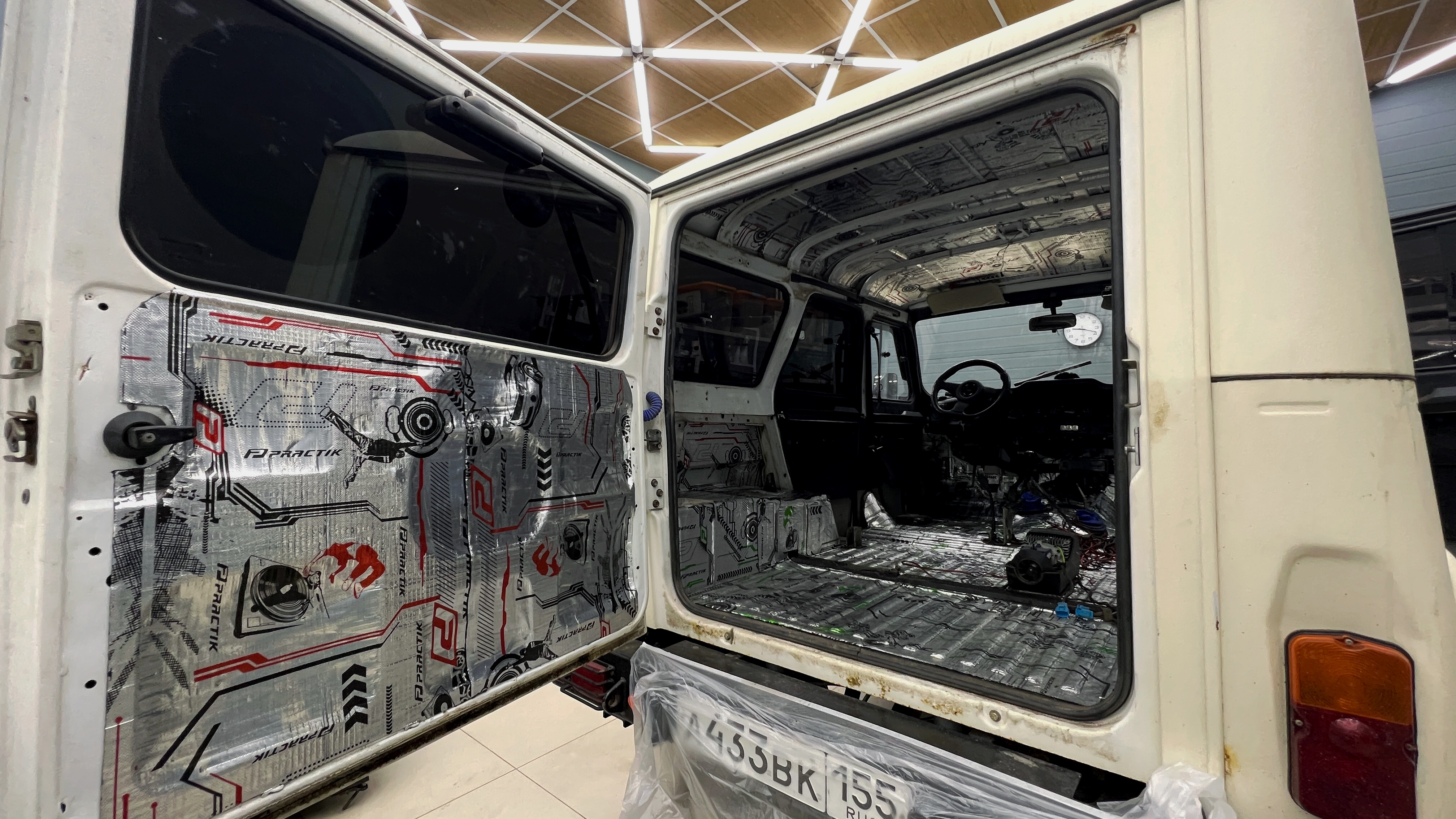 Виброизоляция пятой двери УАЗ Хантер Для виброизоляции двери багажника используем материал Practik 2,1, чтобы свести увеличение веса к минимуму. После чего переходим к обшивке. Обшивку пятой двери оклеиваем Flex А15 для устранения ненужных скрипов и бряков.