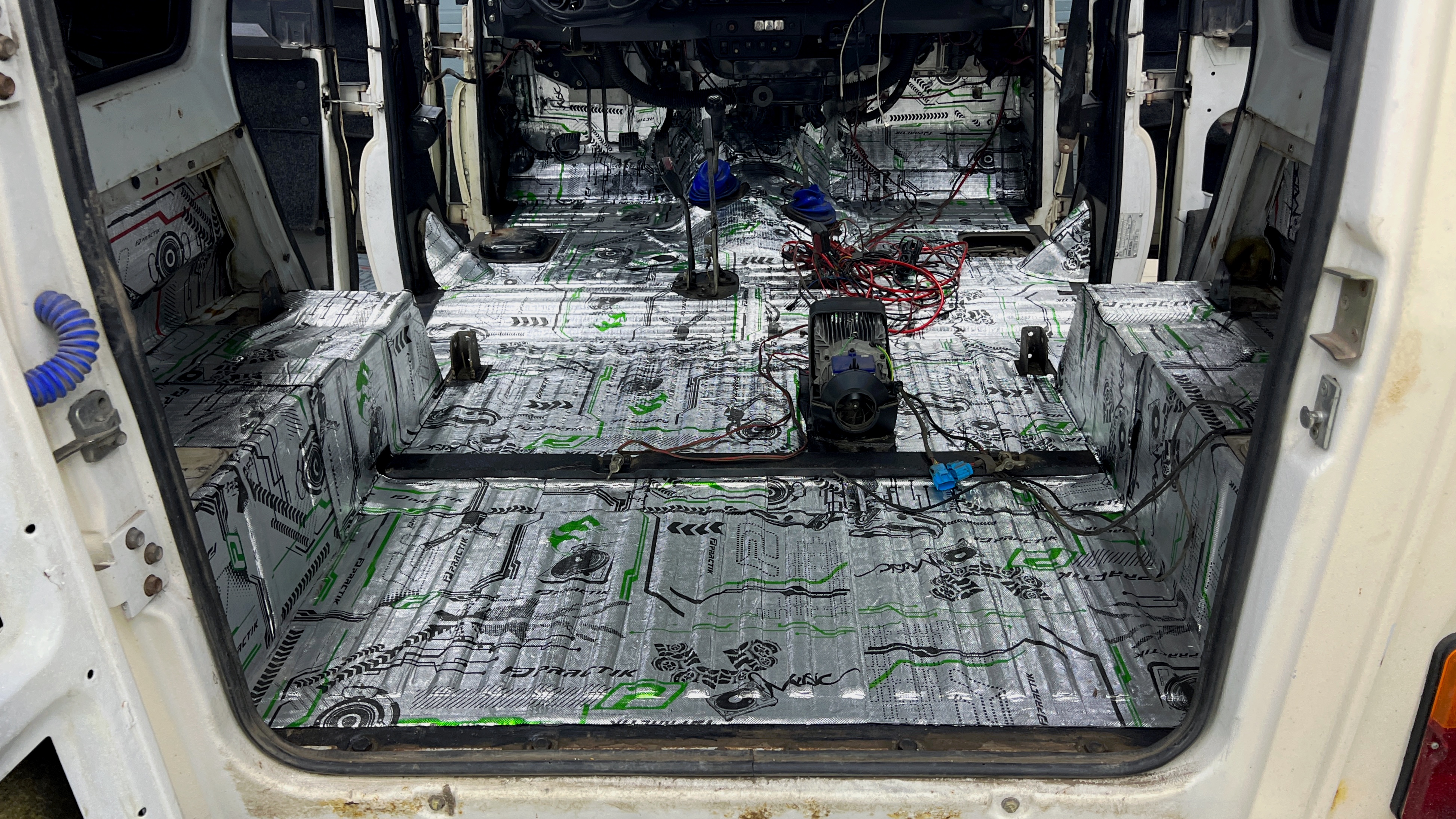 Максимально вверх к моторной перегородки и до заднего сиденья поверх Герметон 7Л клеим звукоизоляционную мембрану Practik Finish толщиной 2,5 мм. Арки оклеиваем также Practik Finish