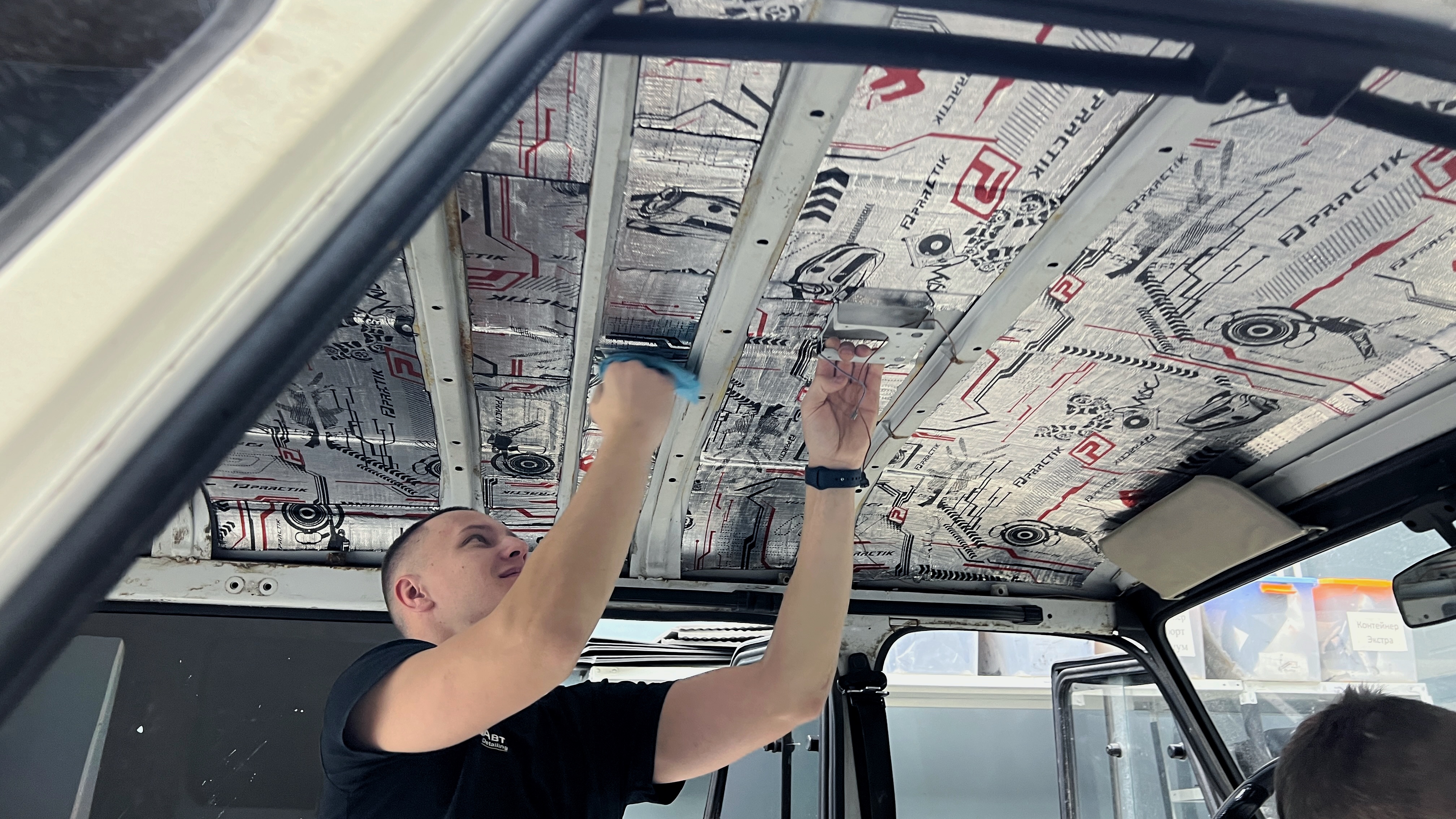 Завершаем шумоизоляцию нанесением третьего слоя звукоизоляционной мембраны Practik Finish на арки.